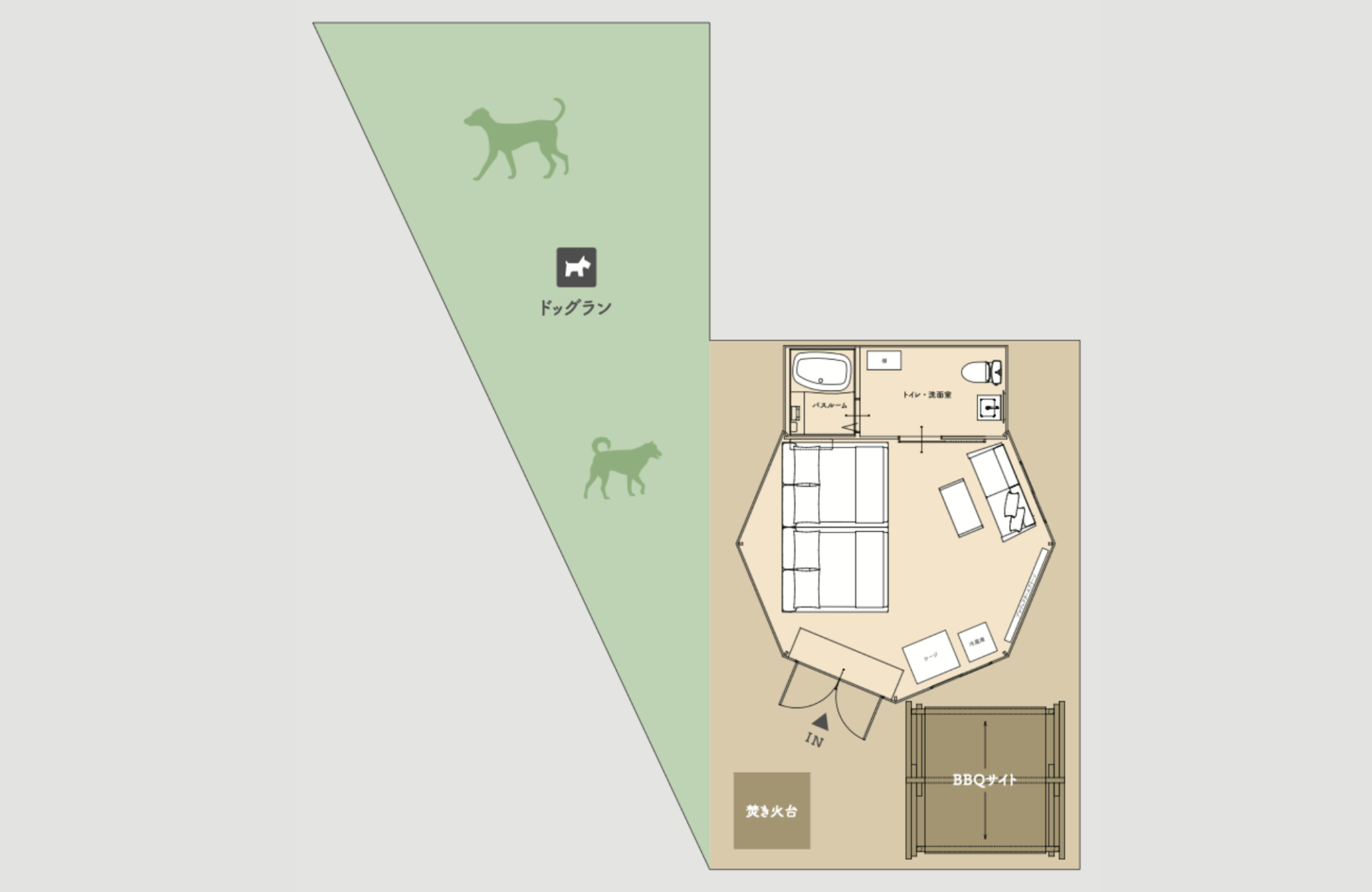 【ドッグラン付き】 プライベートゲルテント(クイーンベッド×2・ソファベッド×1)