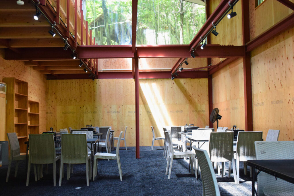 渓流沿いの屋根付きテラス席は、自然を感じられる涼しいエリアです。