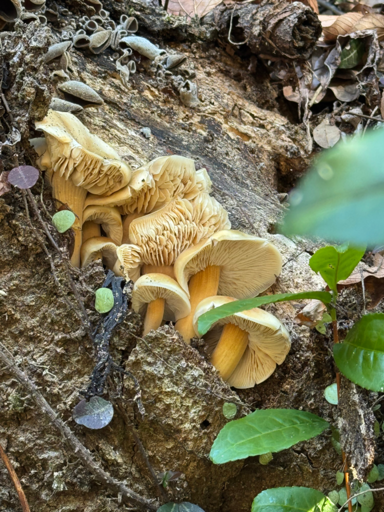 白っぽいきのこの名前は不明ですが、上に生えてるのは木耳(きくらげ)ですね。