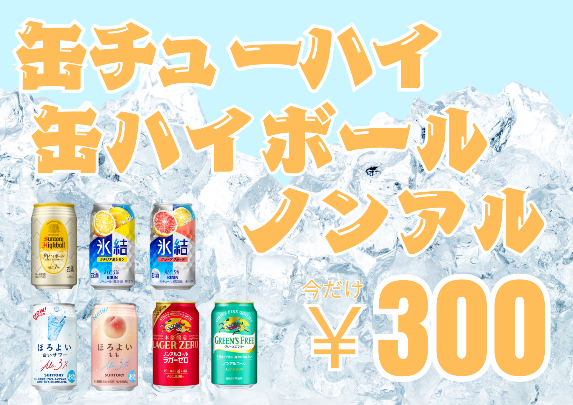 キャンペーン(日帰り/宿泊) 2026.04.10 【無くなり次第終了】缶ドリンク各種300円キャンペーン開催! チューハイ・ハイボール・ノンアルビールを1本300円でご提供! 「気軽に1本楽しみたい」「ちょっとだけ飲み足りない」 そんなさまざまなシーンに合わせてお選びいただける、お手軽価格でお楽しみいただけます。 対象期間 2026年4月11日(土)〜 ※なくなり次第終了となりますのでお早めに!