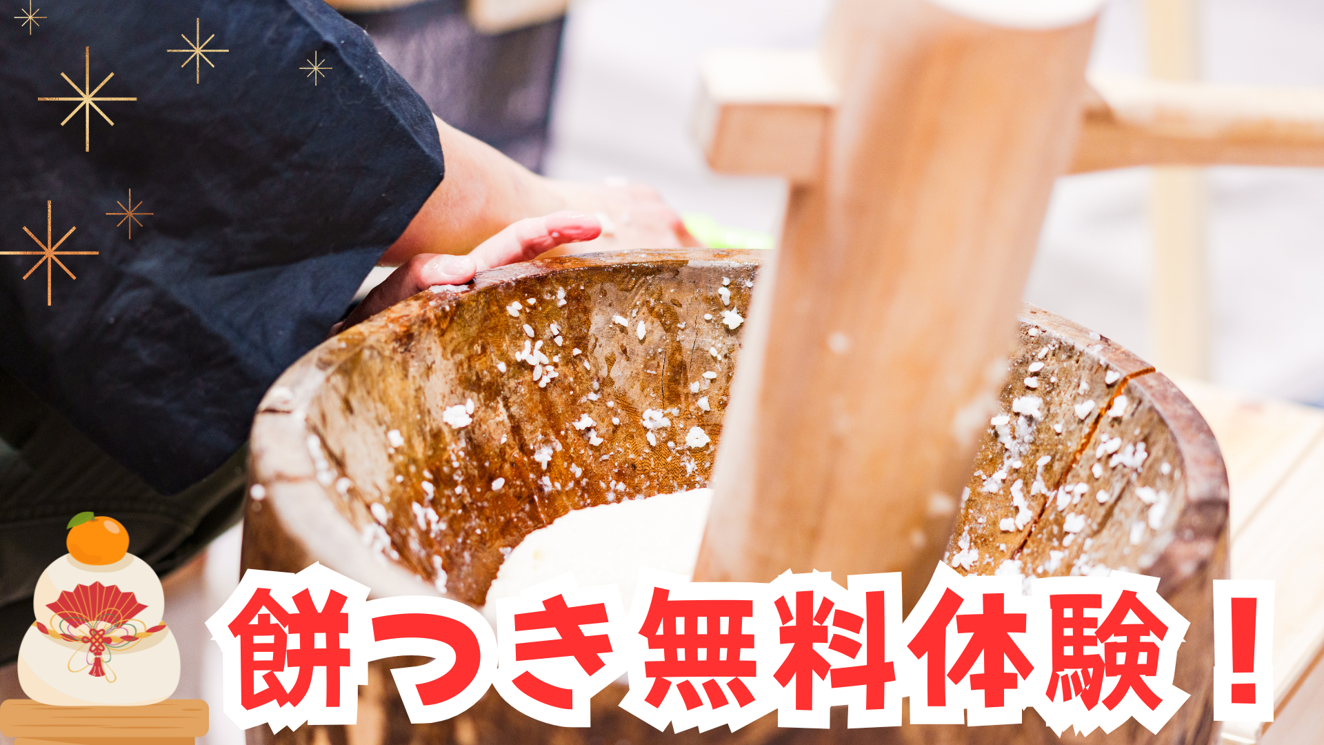 臼と杵を使った本格的な餅つき体験を無料で開催いたします。