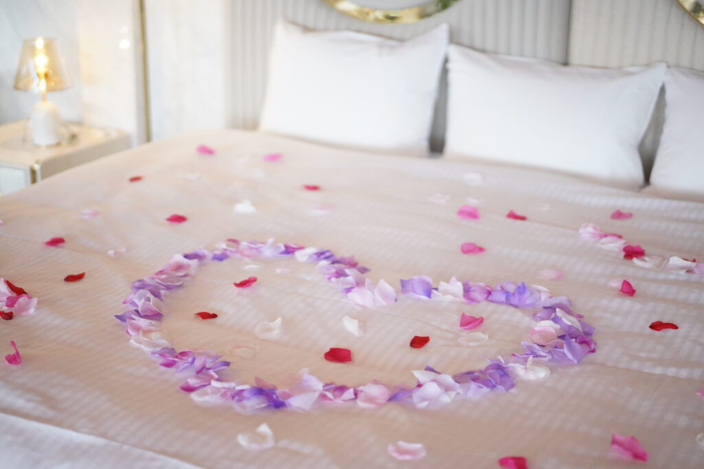 ベッドの上に花びらを美しく散りばめた、ロマンティックな空間演出。