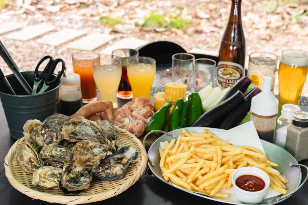 牡蠣1㎏・フライドポテト・鶏もも肉・ソーセージ・スペアリブ・焼き野菜5種 ソフトドリンクバー |