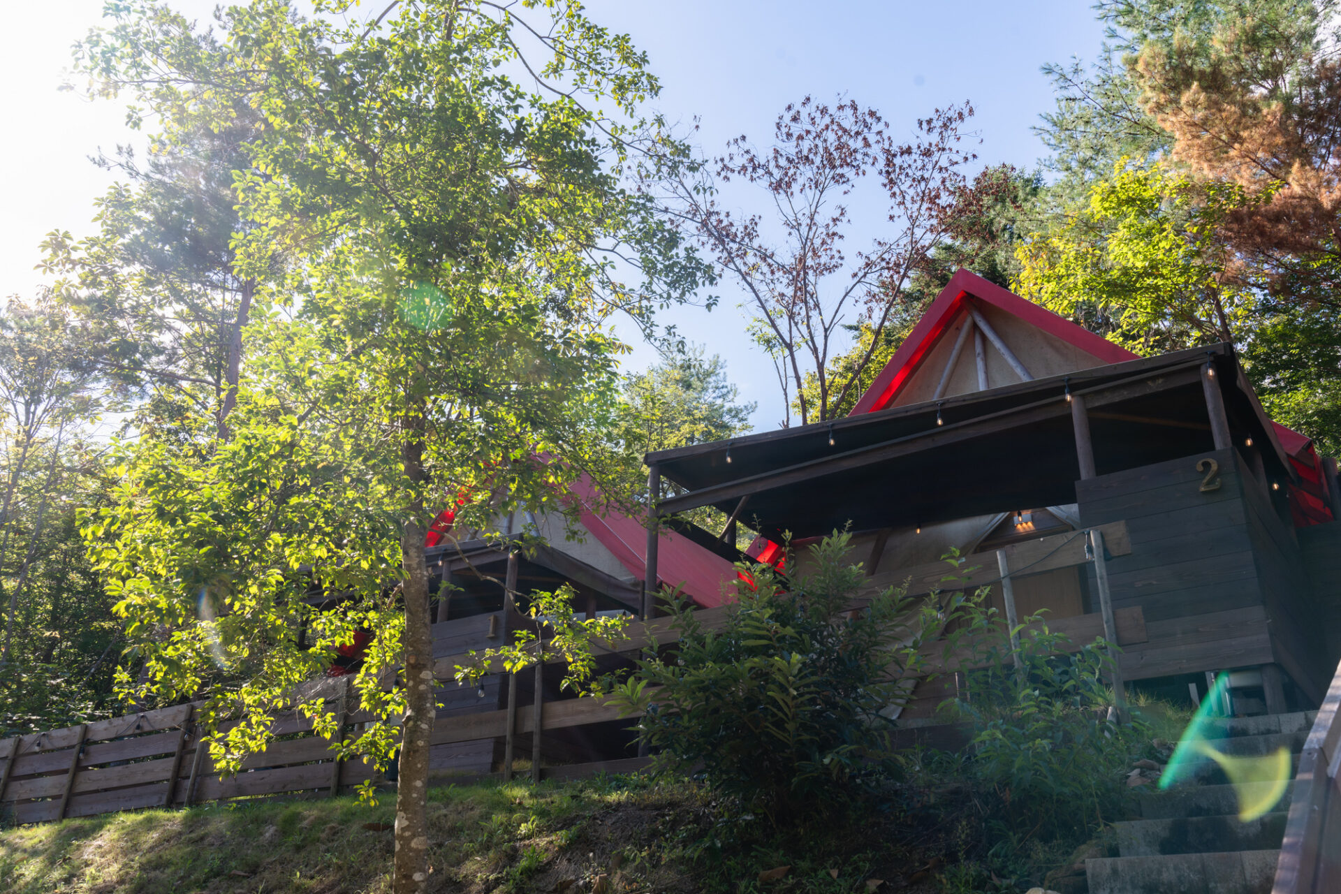 浴室・お手洗い・洗面・冷暖房までそろう赤いお屋根がポイントのグランピングテント。