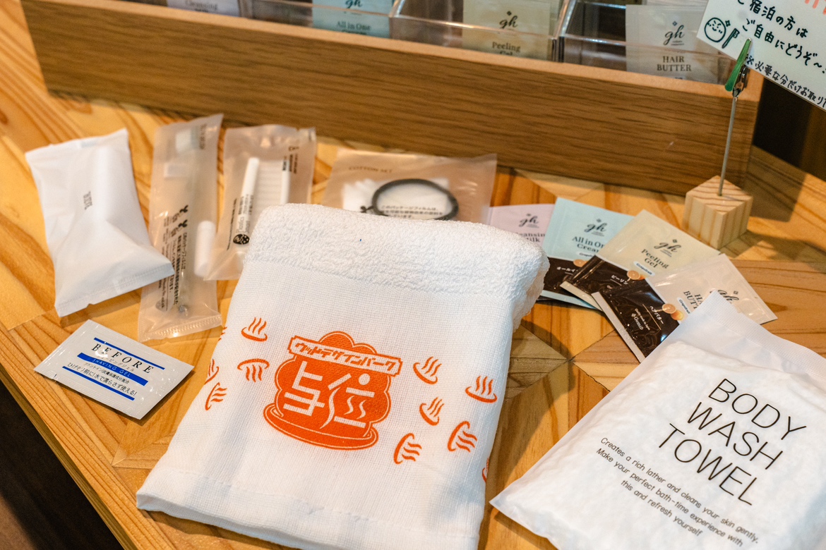 お部屋に用意された桶にあるオリジナルタオルをお持ちください。チェックイン当日であれば何度でも入浴いただけます。